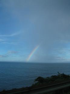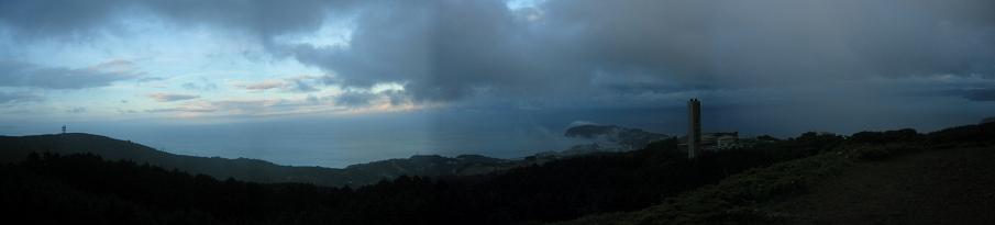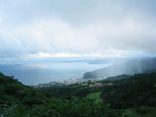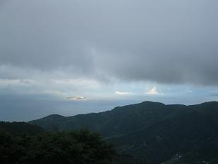 | 西湘バイパス大磯I.C辺りからの海岸線 台風前日ということで箱根近辺は雲がかかっており天気が危ぶまれる。怪我の功名というべきか天候の変化で虹を臨むことができた。 |